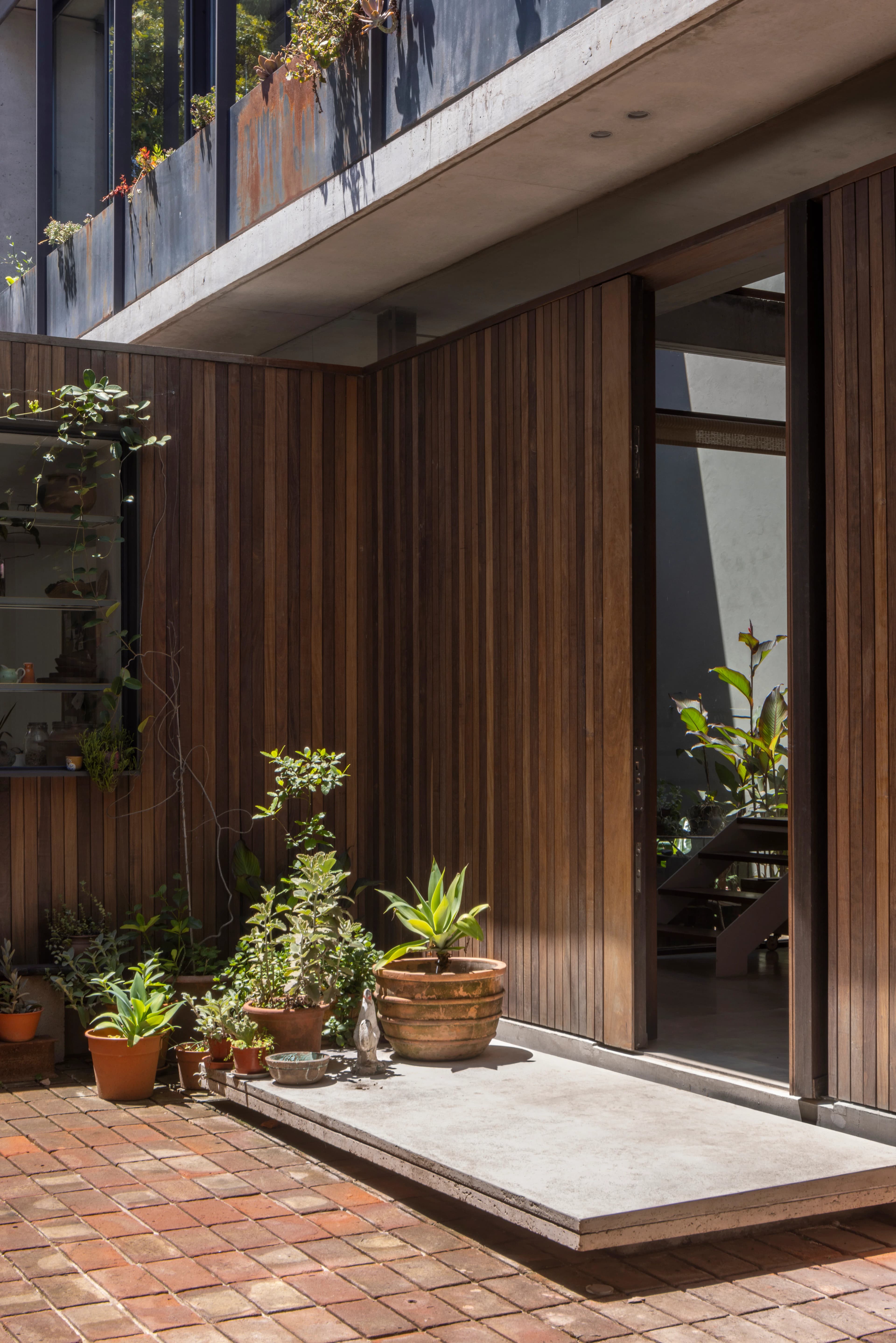 2022Ubicada en Florida, dentro de un entorno de baja densidad y jardines consolidados, la vivienda se implanta en un lote de 10 x 50 metros donde la vegetación espontánea y las copas de los árboles vecinos definen el escenario de partida. Es precisamente la presencia de una magnolia el elemento que determina la implantación y el límite del proyecto, actuando como el eje natural sobre el cual se organiza la arquitectura. La casa se estructura axialmente sobre una de sus medianeras, liberando un generoso patio longitudinal que garantiza el asoleamiento en toda su extensión. Esta linealidad solo se ve interrumpida en planta baja por el volumen independiente de la cocina; una pieza de menor altura que segmenta el exterior en dos instancias: un patio frontal que califica el acceso y un patio posterior que otorga intimidad al área social. Este segundo espacio de expansión queda protegido bajo el follaje de la magnolia, cuya copa establece una relación sensorial con la planta alta, perfumando la habitación principal que se abre hacia la profundidad del pulmón de manzana. El programa termina de articularse mediante un patio interno que fragmenta ambos niveles, permitiendo que las áreas de servicio cuenten con iluminación y ventilación natural. Hacia la calle, la planta alta toma la totalidad del ancho del lote, generando un semicubierto en el nivel cero que funciona como área de guardacoches. La materialidad refuerza la síntesis del proyecto: la planta baja, revestida íntegramente en madera de lapacho, se despega visualmente de la losa de hormigón, mientras que en el nivel superior, el cerramiento longitudinal se espesa mediante un ritmo continuo de toldos y maceteros que regulan la privacidad. Finalmente, la flora espontánea preservada antes del inicio de la obra fue reincorporada al finalizar la construcción, devolviendo al lote su hábitat original y consolidando el paisaje de la casa.